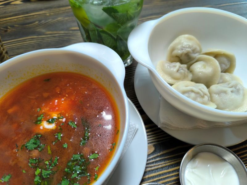 ボルシチの小サイズとペリメニも小サイズをオーダーして、その他にサラダか肉系を一皿がいいかな。